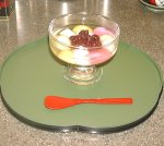 白玉あんみつ。白玉を ピンク、黄色、緑に色づけて